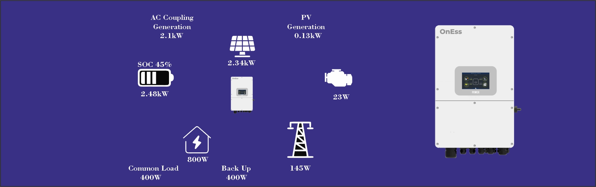 La gama de inversores Híbridos OnEss se caracteriza principalmente por tener una pantalla de 7 pulgadas, con registro de eventos y alarmas, entrada de generador inteligente que pude trabajar como fuente de corriente activa o pasiva, es decir; puedes conectar un generador eléctrico, un inversor on grid, o inclusive usar dicha salida para conectar consumos eléctricos no prioritarios o consumos intermitentes con calefacción, suelo radiante, etc.